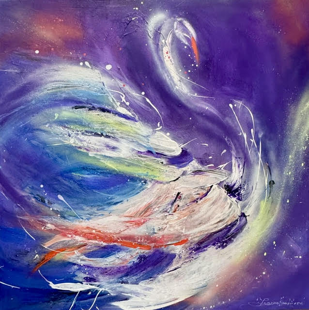 On a rich blue background, an elegant white swan stands out as a symbol of peace, beauty, and harmony. Dynamic strokes and layers of color create an abstract, flowing movement of water around the swan, while the contrast between bright white and deep blue evokes both calm and freedom.